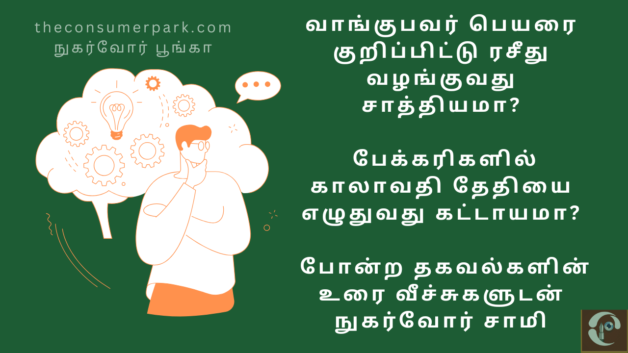 வாங்குபவர் பெயரை குறிப்பிட்டு ரசீது வழங்குவது சாத்தியமா? பேக்கரிகளில் காலாவதி தேதியை எழுதுவது கட்டாயமா? போன்ற தகவல்களின் உரை வீச்சுகளுடன் நுகர்வோர் சாமி