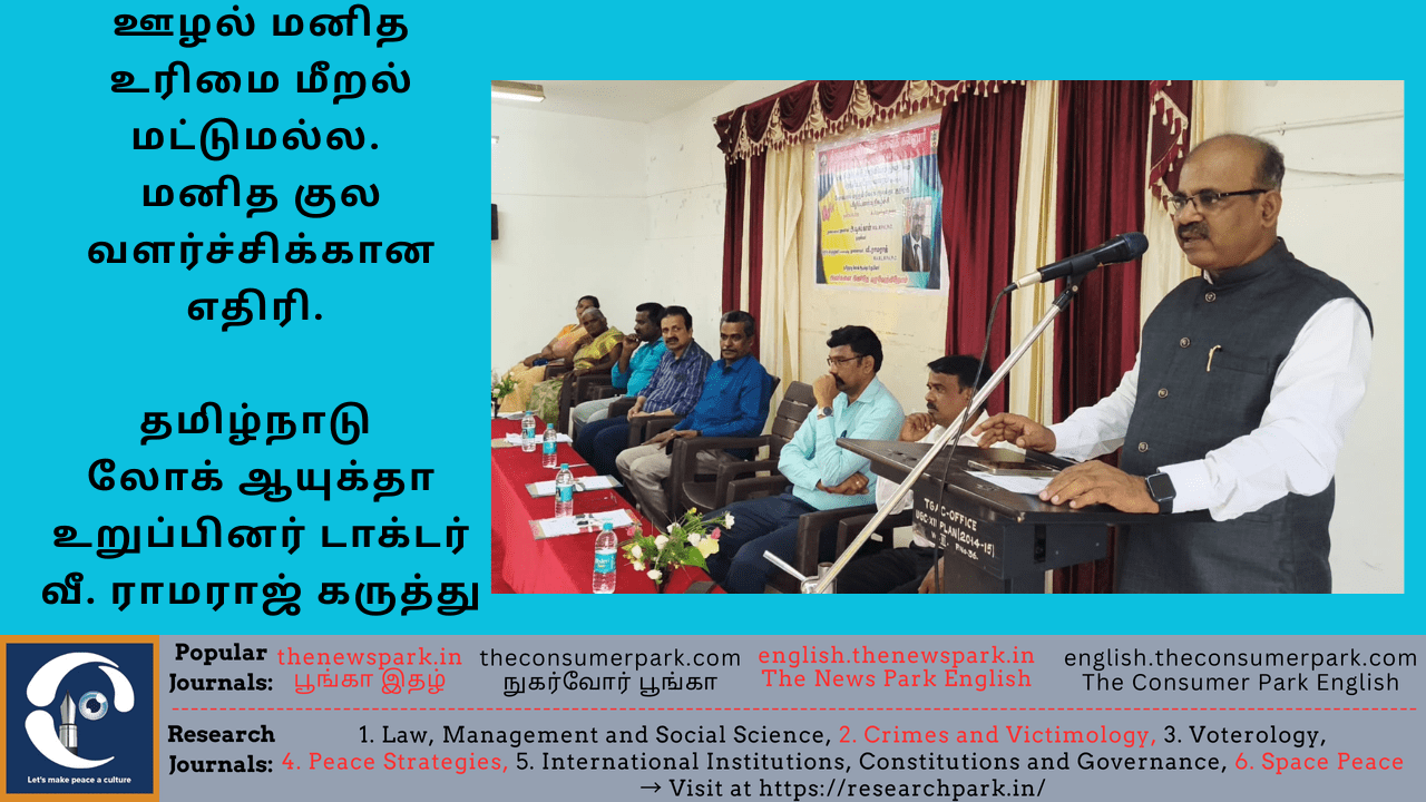ஊழல் மனித உரிமை மீறல் மட்டுமல்ல. மனித குல வளர்ச்சிக்கான எதிரி. தமிழ்நாடு லோக் ஆயுக்தா உறுப்பினர் டாக்டர் வீ. ராமராஜ் கருத்து