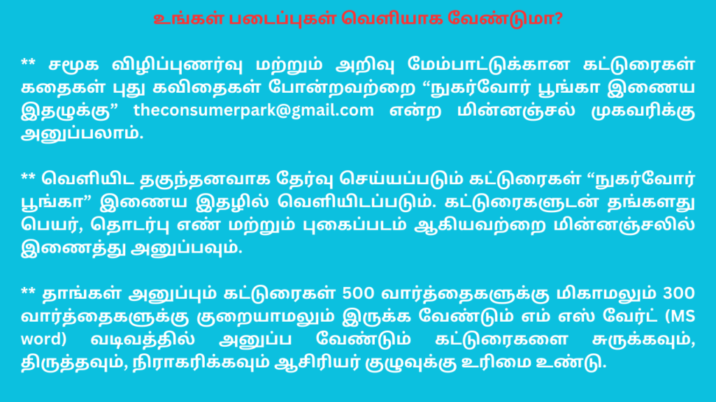 நுகர்வோர் முன்னெச்சரிக்கையாக இருக்கவும் பாதிப்புக்குள்ளாகும் போது தீர்வு காணவும் நுகர்வோர் உரிமைகளுக்கும் நுகர்வோர் பாதுகாப்புக்கும் “நுகர்வோர் பூங்கா” படியுங்கள்!   ●   செய்தி மற்றும் தகவல் கட்டுரைகளுக்கும் அறிவை மேம்படுத்த உதவும் படைப்புகளுக்கும் “பூங்கா இதழ்” படியுங்கள்!   ●   கட்டணமில்லாமல் படிக்க பொதுத்தளமாக வெளியிடப்படும் “பூங்கா இதழ்” மற்றும் “நுகர்வோர் பூங்கா” - இணையதள இதழ்களுக்கு ஆதரவு தாருங்கள்! விவரங்களுக்கு “நாங்கள்” பகுதியை படியுங்கள்!