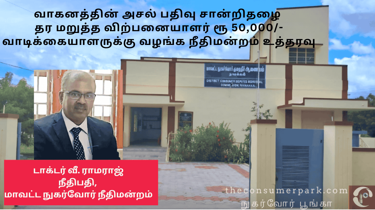 வாகனத்தின் அசல் பதிவு சான்றிதழை தர மறுத்த விற்பனையாளர் ரூ 50,000/- வாடிக்கையாளருக்கு வழங்க நாமக்கல் மாவட்ட நுகர்வோர் நீதிமன்றம் உத்தரவு