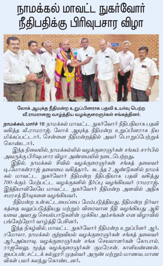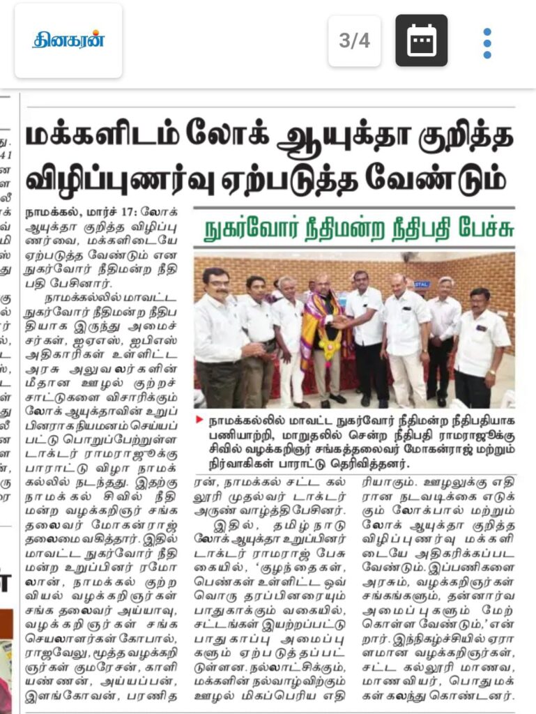 நாமக்கல்லில் மாவட்ட நுகர்வோர் நீதிபதியாக இருந்து அமைச்சர்கள், ஐஏஎஸ், ஐபிஎஸ் அதிகாரிகள் உள்ளிட்ட அரசு அலுவலர்களின் மீதான ஊழல் குற்றச்சாட்டுகளை விசாரிக்கும் லோக் ஆயுக்தாவின் உறுப்பினராக நியமனம் செய்யப்பட்டு பொறுப்பேற்றுள்ள டாக்டர் வீ. ராமராஜ் அவர்களுக்கு பாராட்டு விழா நாமக்கல்லில் நடைபெற்றது. நாமக்கல் சிவில் வழக்கறிஞர்கள் சங்கத்தின் தலைவர் டி மோகன்ராஜ் மற்றும் நாமக்கல் குற்றவியல் வழக்கறிஞர்கள் சங்கத்தின் தலைவரும் பார் கவுன்சில் உறுப்பினருமான ஆர். அய்யாவு ஆகியோர் பாராட்டு விழாவிற்கு கூட்டாக தலைமை வகித்தனர். (படத்துக்கு கீழே செய்தி தொடர்கிறது)