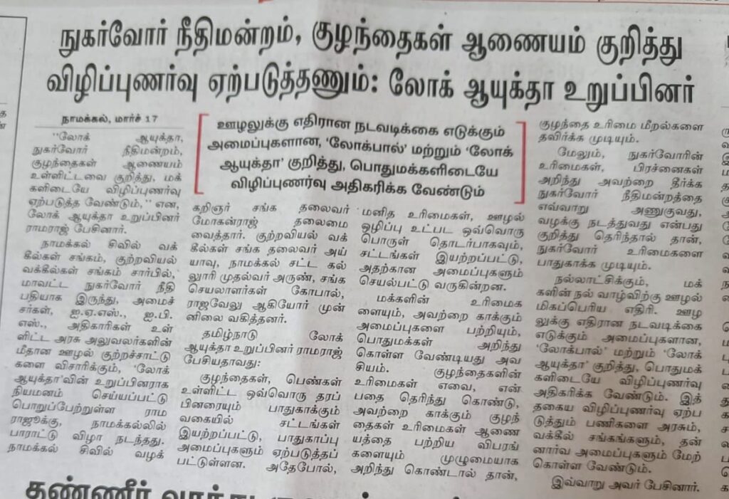 லோக் ஆயுக்தா, நுகர்வோர் நீதிமன்றங்கள், குழந்தைகள் ஆணையம் உள்ளிட்டவை குறித்த விழிப்புணர்வு மக்களிடையே ஏற்படுத்தப்பட வேண்டும் – லோக் ஆயுக்தா உறுப்பினர் டாக்டர் வீ. ராமராஜ் வலியுறுத்தல்.