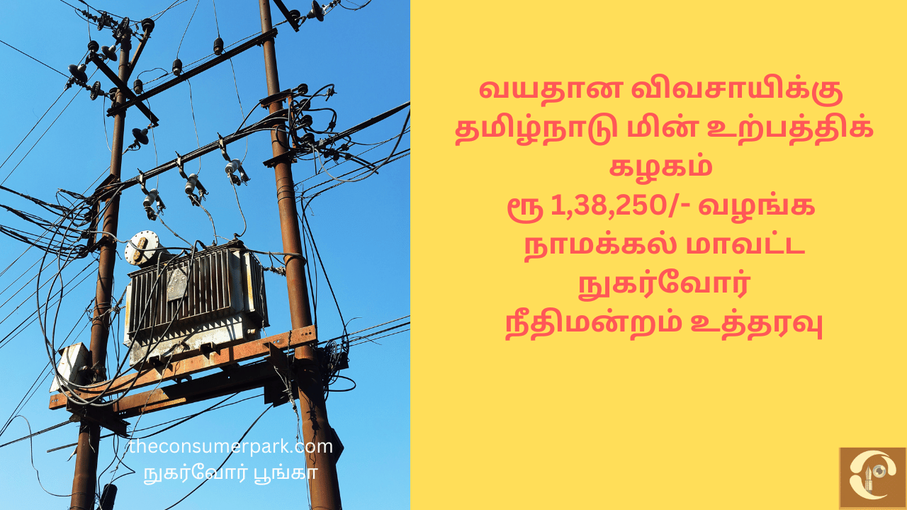 வயதான விவசாயிக்கு தமிழ்நாடு மின் உற்பத்திக் கழகம் ரூ 1,38,250/- வழங்க நாமக்கல் மாவட்டம் நுகர்வோர் நீதிமன்றம் உத்தரவு