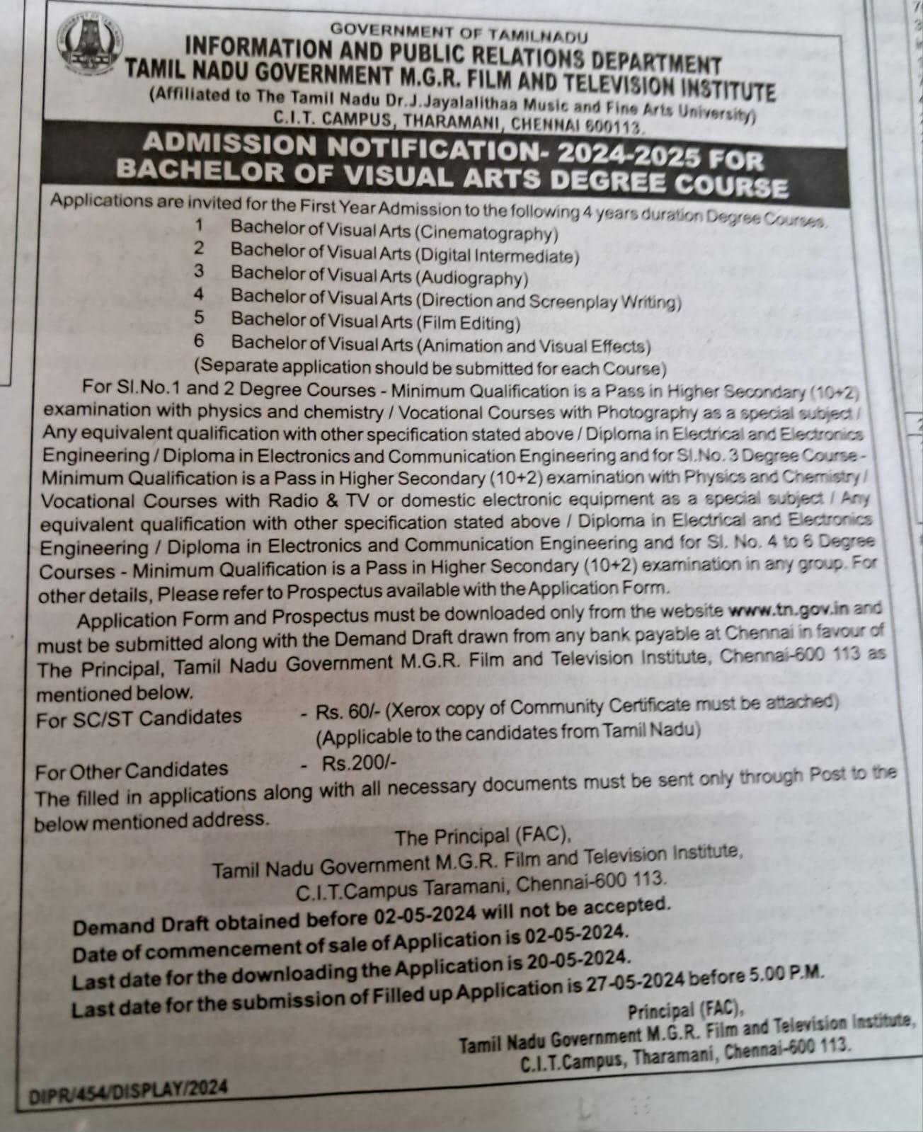 2024-25 ஆம் ஆண்டுக்கான சேர்க்கை விளம்பரம் வெளியிடப்பட்டுள்ளது. விண்ணப்பப் படிவங்கள் மற்றும் தகவல் தொகுப்பேட்டினை www.tn.gov.in என்ற இணையதம் வாயிலாக பதிவிறக்கம் செய்து கொள்ளலாம். விண்ணப்பங்களை பதிவிறக்கம் செய்ய இறுதி நாள் 20-05-2024. பூர்த்தி செய்யப்பட்ட விண்ணப்பங்கள் 27-05-2024 ஆம் தேதி மாலை 5 மணிக்குள்   முதல்வர், தமிழ்நாடு அரசு எம் ஜி ஆர் திரைப்படம் மற்றும் தொலைக்காட்சி கல்வி நிறுவனம், சிஐடி கேம்பஸ், தரமணி, சென்னை -600 113 என்ற முகவரியில் சமர்ப்பிக்கப்பட வேண்டும்.