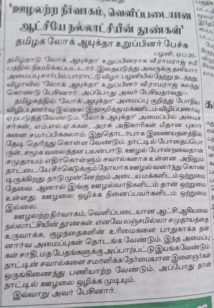 இத்தகைய தன்னார்வ சங்கங்கள் அரசியல் கட்சிகளுக்கு அப்பாற்பட்டும்   சாதி, மதம் போன்ற   வட்டங்களுக்கு அப்பாற்பட்டும் இயங்குவதாக இருக்க வேண்டும். இவற்றை வழிநடத்த நேர்மையான இளைஞர்கள் முன் வர வேண்டும். இதன் மூலம் நாட்டில் நிலவும் ஊழலை ஒழிக்க இயலும். அமைச்சர்கள், எம் எல் ஏக்கள், ஐஏஎஸ்,  ஐபிஎஸ் அதிகாரிகள் முதல் அரசின் கடைநிலை ஊழியர் வரை   அரசு பணியாளர்கள் மீதான ஊழல் குறித்த புகார்களை தமிழ்நாடு லோக் ஆயுக்தாவில் சமர்ப்பிக்கலாம். இத்தகைய புகார்கள் எவ்வாறு சமர்ப்பிக்கப்பட வேண்டும் என்ற முழுமையான விவரம் தமிழ்நாடு லோக் ஆயுக்தாவின் இணையதளத்தில் வெளியிடப்பட்டுள்ளது. ஊழலற்ற நிர்வாகமும் வெளிப்படையான ஆட்சி முறையும் நல்லாட்சிக்கு தூண்களாக விளங்குகின்றன என்று லோக் ஆயுக்தா நீதிபதி வீ. ராமராஜ் பேசினார்.