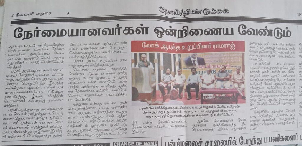 தமிழ்நாடு லோக் ஆயுக்தா நீதிபதியாக பொறுப்பேற்றுள்ள டாக்டர் வீ. ராமராஜ் அவர்களுக்கு பழனி எல்ஐசி முகவர்கள் சங்கத்தின் சார்பில்   சங்கத்தின் பொருளாளர் பி. சின்னராஜ் தலைமையில் பாராட்டு விழா (felicitation) நடைபெற்றது. நாடு எதிர்நோக்கியுள்ள சவால்களை சமாளிக்க  நேர்மையாளர்கள் ஒருங்கிணைந்து பணியாற்ற வேண்டும் என்று ஏற்புரை வழங்கிய லோக் ஆயுக்தா நீதிபதி டாக்டர் வீ. ராமராஜ் வலியுறுத்தினார் அவர் பேசியதாவது. Honest people should join – Dr V. Ramaraj, Tamil Nadu Lokauktha.