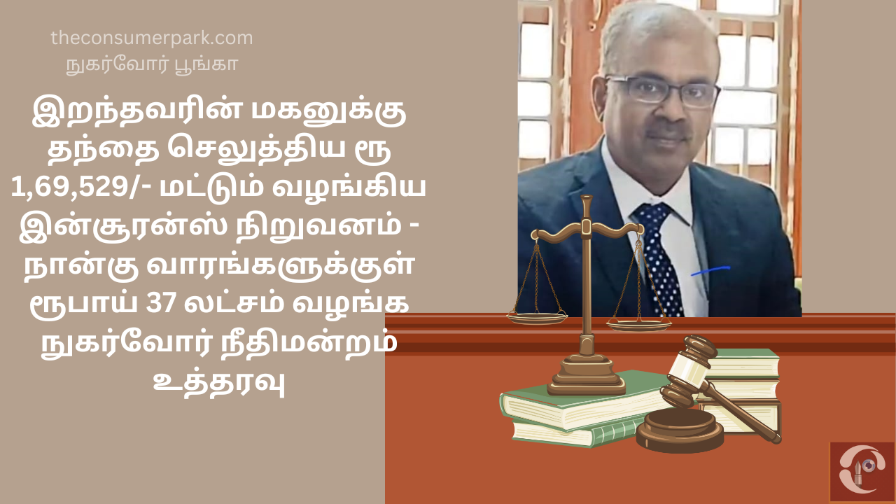 இறந்தவரின் மகனுக்கு தந்தை செலுத்திய ரூ 1,69,529/- மட்டும் வழங்கிய இன்சூரன்ஸ் நிறுவனம் – நான்கு வாரங்களுக்குள் ரூபாய் 37 லட்சம் வழங்க நுகர்வோர் நீதிமன்றம் உத்தரவு