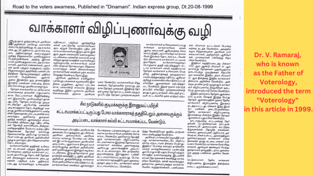 Dr. V Ramaraj first introduced the term “Voterology” in the above article in 1999. He brought forth the concept of “Voterology”, discussing its significance and requirements. At a gathering of voluntary organizations involved in the Indian National Voter Awareness Campaign in 2000, Dr V. Ramaraj was named the “Father of Voterology”. He was the District Coordinator for Voluntary Organizations in the National Voter Awareness Campaign. He authored the book “To the Hon’ble Voter” and multiple articles on voting.