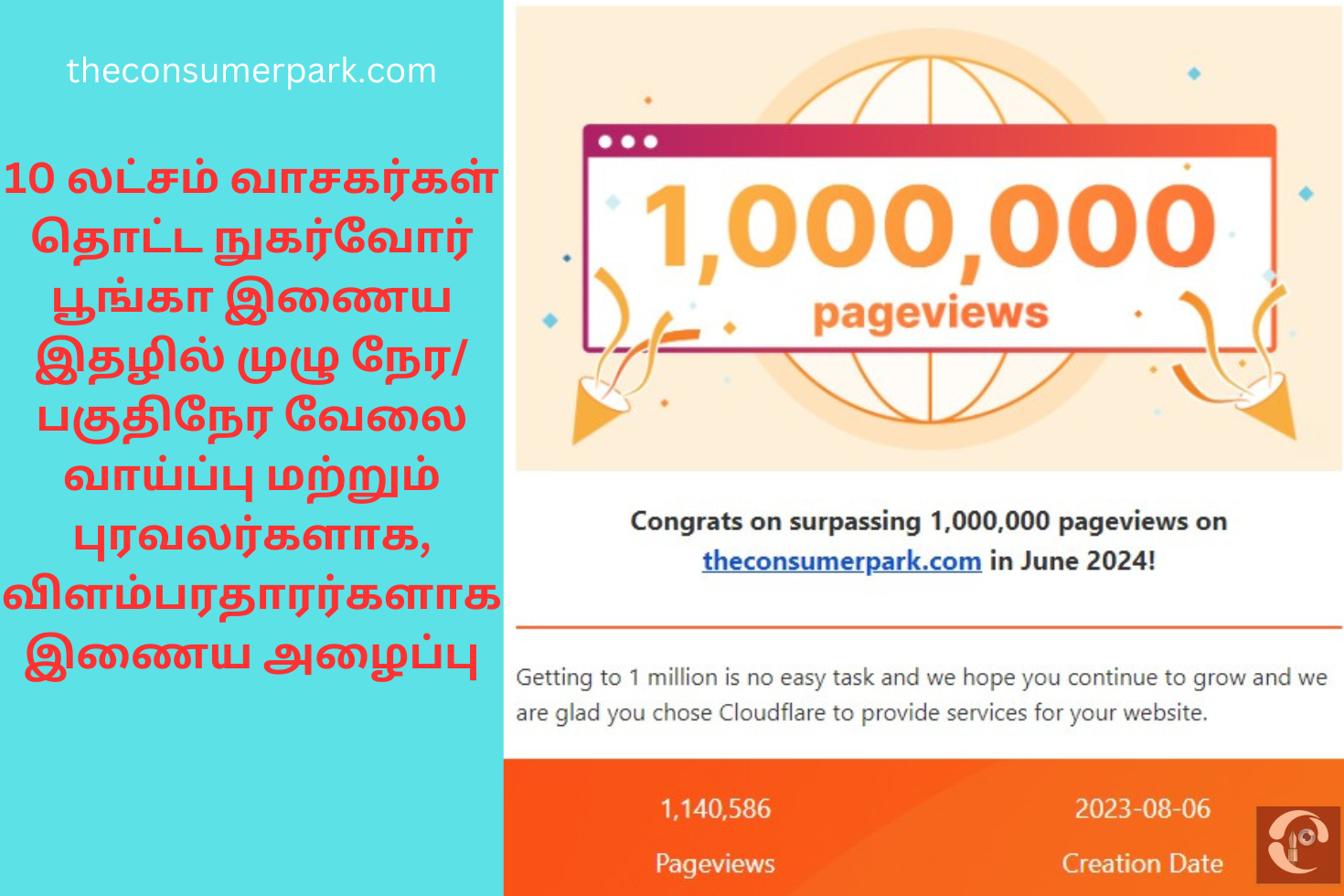 10 லட்சம் வாசகர்கள் தொட்ட நுகர்வோர் பூங்கா இணைய இதழில் முழு நேர பகுதி/நேர வேலை வாய்ப்பு & புரவலர்களாக- விளம்பரதாரர்களாக  இணைய அழைப்பு