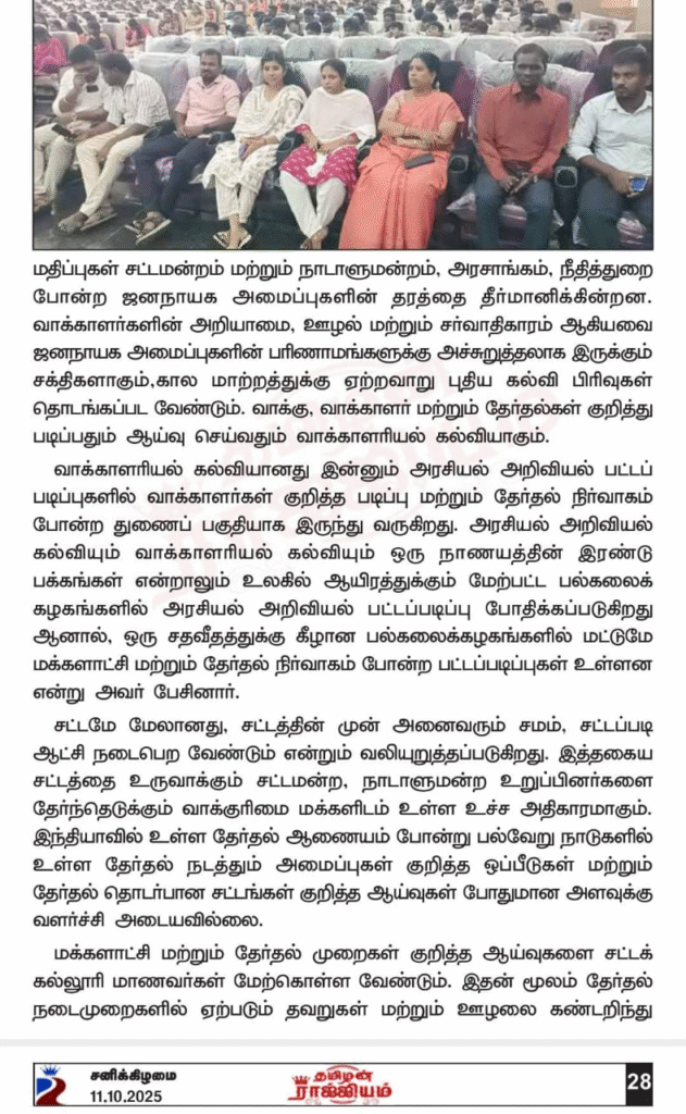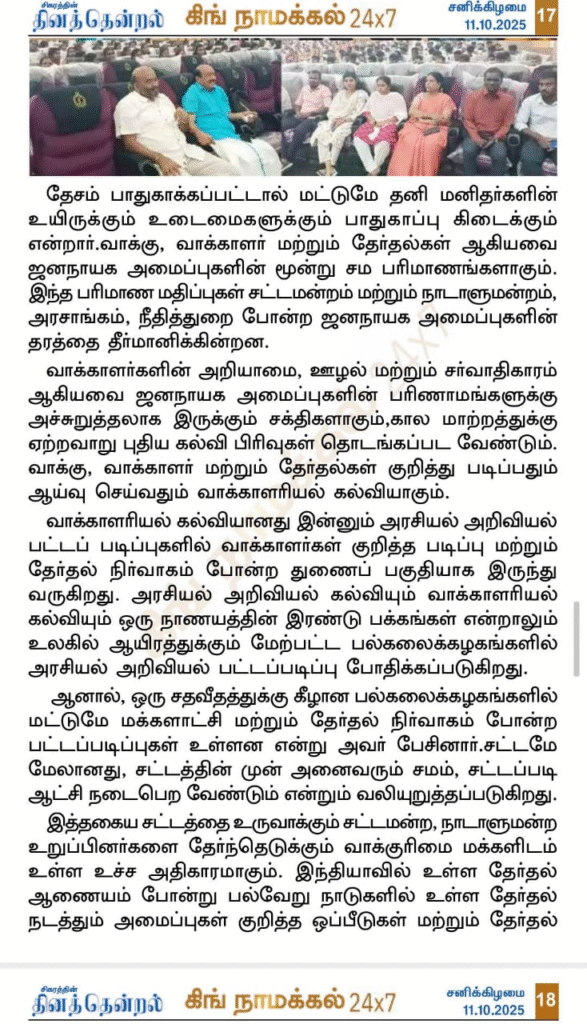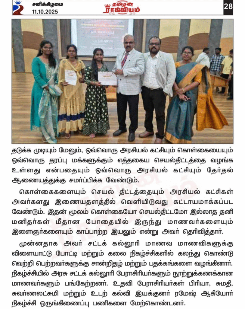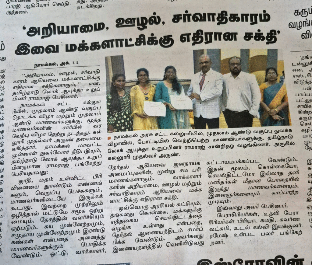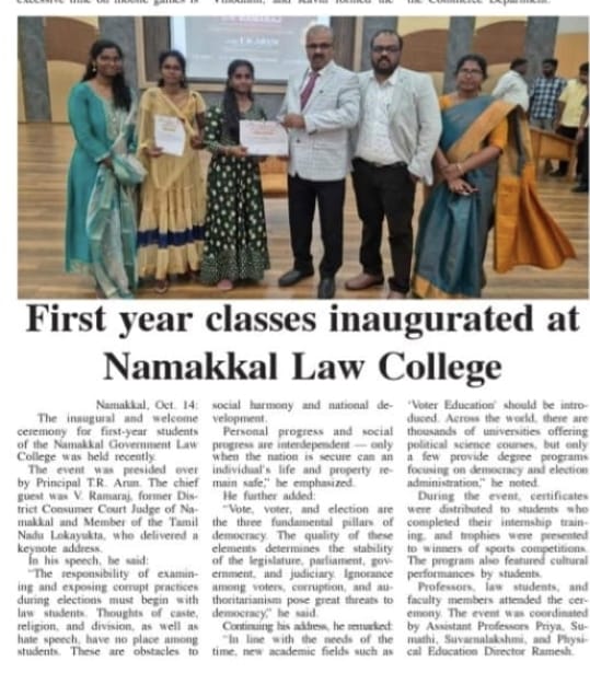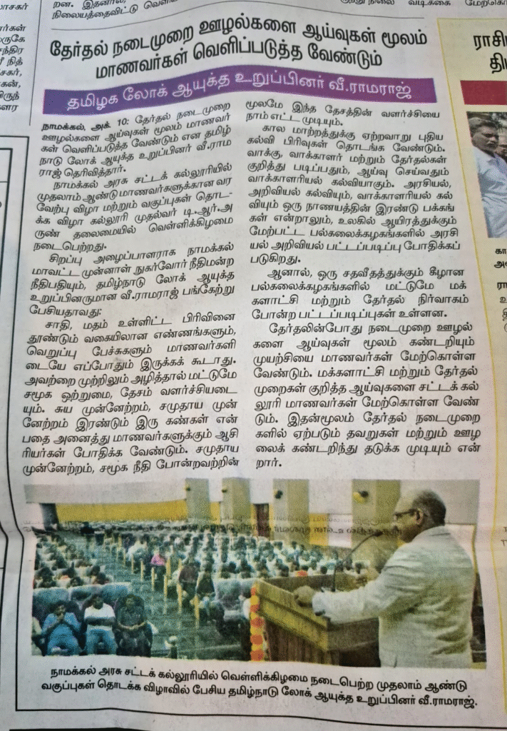 நாமக்கல் சட்டக் கல்லூரி முதலாம் ஆண்டு வகுப்புகள் தொடக்க விழா. பத்திரிக்கை மற்றும் ஊடகங்களில் வெளிவந்த செய்திகளும் புகைப்படங்களும். வாக்காளரியல் கல்வியை வலியுறுத்தும் டாக்டர் வீ. ராமராஜ்