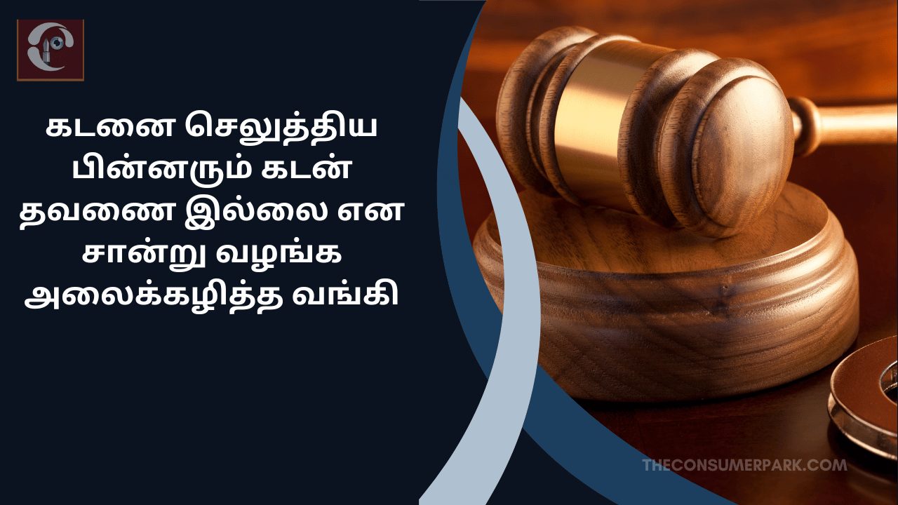 கடனை செலுத்திய பின்னரும் கடன் தவணை இல்லை என சான்று வழங்க அலைக்கழித்த வங்கி