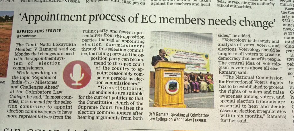 “Voters above all else” is the central idea of ​​voterologism. Changes are needed in the appointment system of Election Commissioners – Tamil Nadu Lokayukta Member Dr. V. Ramaraj