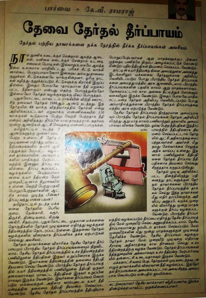 தேர்தல் குறித்த வழக்குகள்  முடிய பல ஆண்டுகள் காலதாமதமானால்   தேர்தலில் வெற்றி பெற்றதாகஅறிவிக்கப்பட்டவர் பதவிக்காலம் முடிந்த பின்பு தோல்வி அடைந்ததாக கூட தீர்ப்பு வரலாம்.  எனவே,  தேர்தல் குறித்த வழக்கு ஆறு மாதங்களுக்குள் முடிக்க தேர்தல் தீர்ப்பாயங்களை அமைக்க வேண்டும் என்று கடந்த  2005 ஆகஸ்ட் மாதத்தில் வெளியான மத்திய அரசின் இரண்டாவது நிர்வாக  சீர்திருத்தத்த ஆணையம் கருத்து தெரிவித்தது பலருக்கு தெரிந்திருக்கலாம்.  தேசிய வாக்காளர் தினத்தை அனுசரிக்க வேண்டும் என்று வலியுறுத்திய டாக்டர் வீ. ராமராஜ் இரண்டாவது நிர்வாக  சீர்திருத்தத்த ஆணையம் தெரிவித்த கருத்தை கடந்த  மார்ச் 2000-ல் பிரபலமான பத்திரிகையை ஒன்றில் வலியுறுத்தி இருந்தார் என்பது குறிப்பிடத்தக்கது. அவரது கட்டுரையின் நகல் கீழே கொடுக்கப்பட்டுள்ளது.