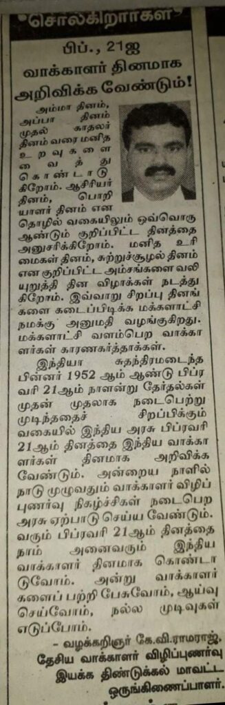 இந்திய தேர்தல் ஆணையத்தின் நிறுவன நாளைக் குறிக்கும் வகையிலும் இளம் வாக்காளர்களை அரசியல் செயல்பாட்டில் பங்கேற்க ஊக்குவிக்கும் வகையிலும், ஒவ்வொரு ஆண்டும் ஜனவரி 25 ஆம் தேதியை “தேசிய வாக்காளர் தினமாக” அனுசரிக்க மத்திய அரசு   கடந்த 2011 ஆம் ஆண்டு முடிவு செய்தது. கடந்த ஜனவரி 1995 ஆம் ஆண்டு முதலே தேசிய வாக்காளர் தினம்   கடைபிடிக்கப்பட வேண்டும் என்று வலியுறுத்தி வந்தவர் யார் தெரியுமா?  1995 ஆம் ஆண்டு ஜனவரி மாதத்தில் பிரபலமான ஒரு தமிழ் தினசரி பத்திரிகையில் வந்த கீழே உள்ள செய்தியை படியுங்கள்.
