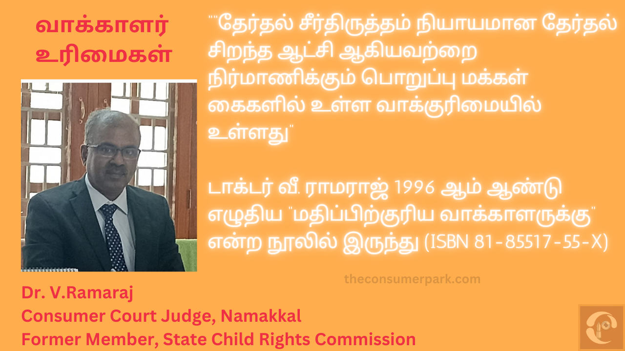 “தேர்தல் சீர்திருத்தம் நியாயமான தேர்தல் சிறந்த ஆட்சி ஆகியவற்றை நிர்மாணிக்கும் பொறுப்பு மக்கள் கைகளில் உள்ள வாக்குரிமையில் உள்ளது” என்று டாக்டர் வீ. ராமராஜ் எழுதிய “மதிப்பிற்குரிய வாக்காளருக்கு” என்ற நூலில் 1996 ஆம் ஆண்டு எழுதிய கருத்து   இன்னும் பொருத்தமானதாகவே உள்ளது.  # Dr. V. Ramaraj  #Father of Voterology